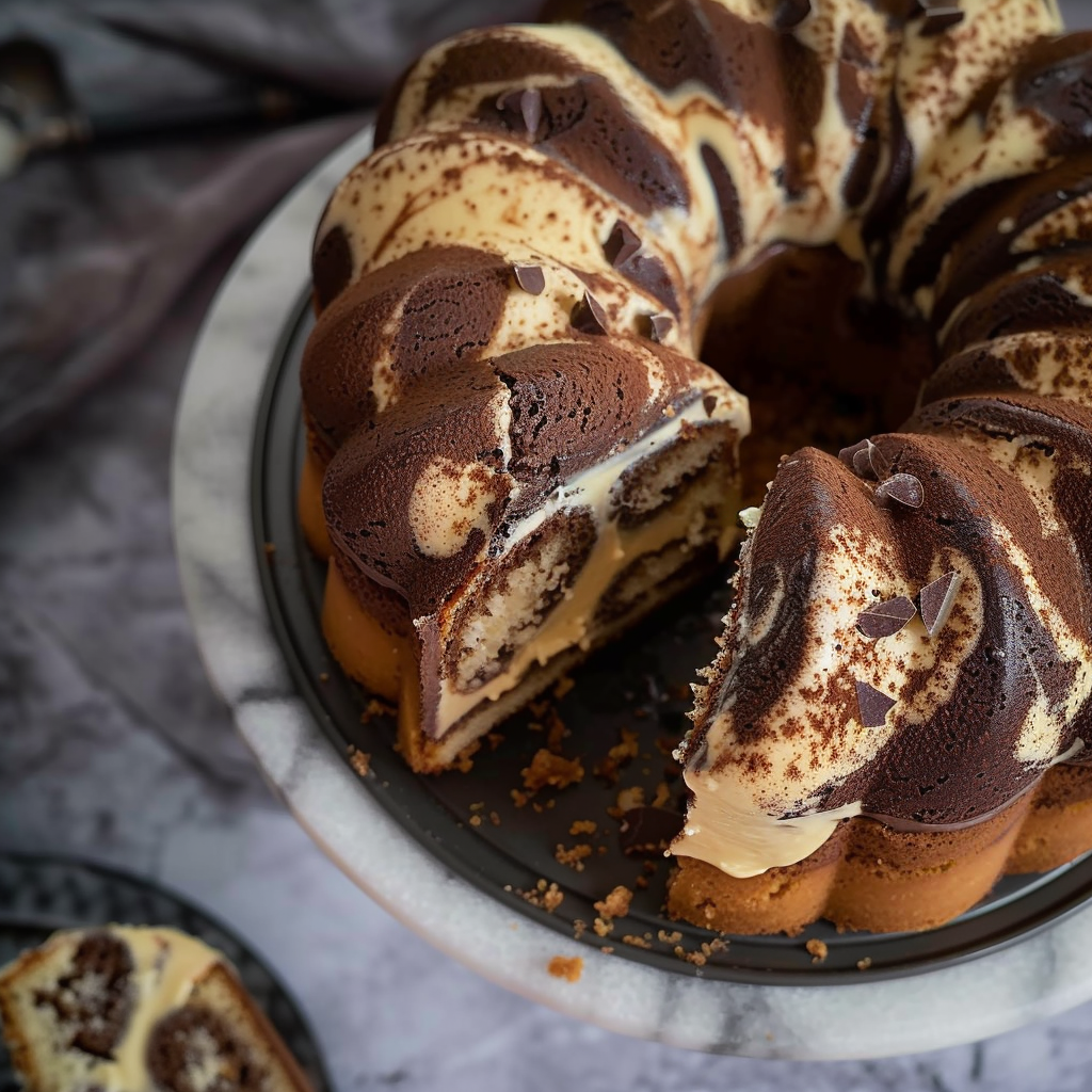 - Vierte la mezcla blanca en un molde engrasado y enharinado, alternando con líneas de la mezcla de cacao hasta terminar ambas mezclas.