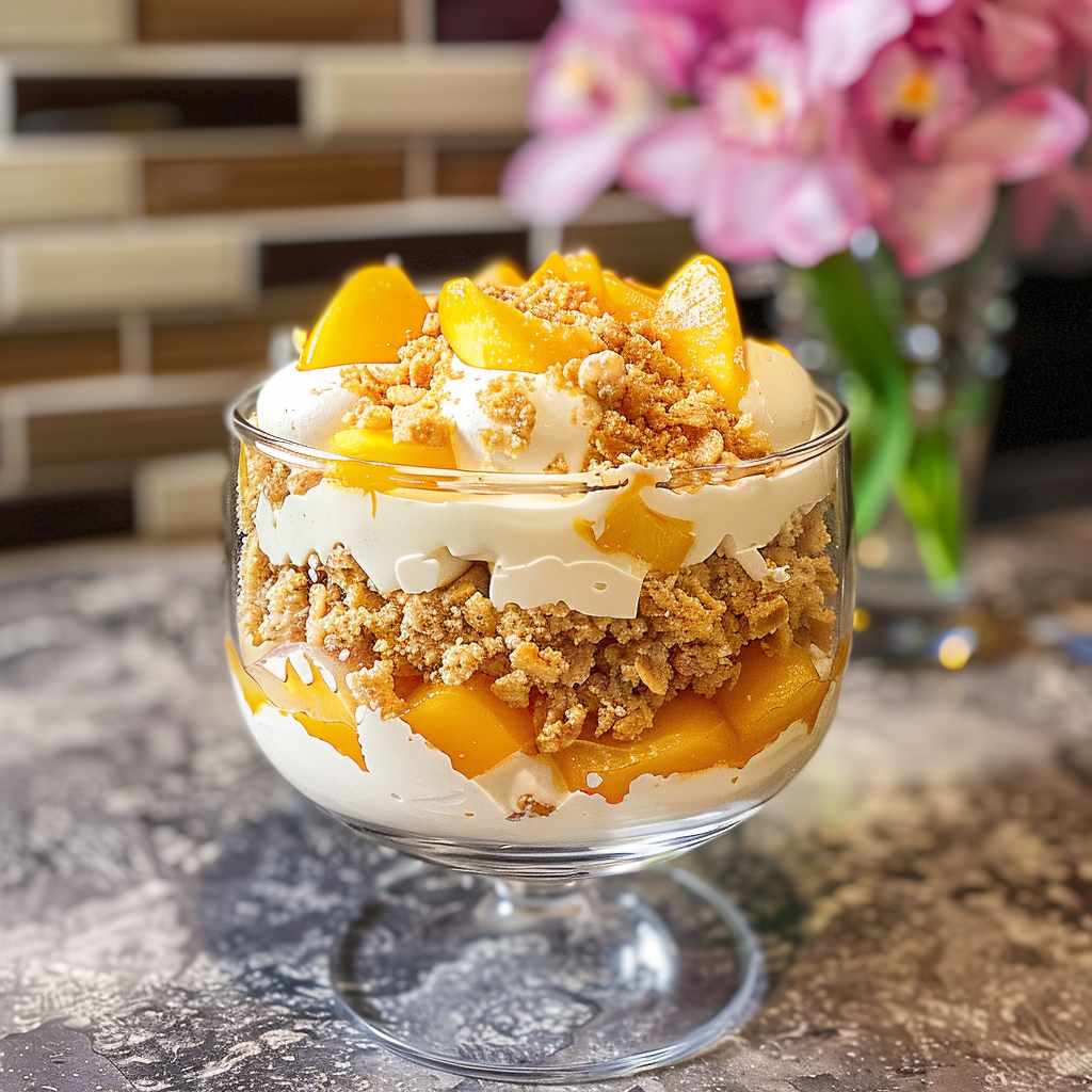 - 4 duraznos frescos, pelados y cortados en rodajas (o 1 lata grande de duraznos en almíbar, escurridos y cortados)
